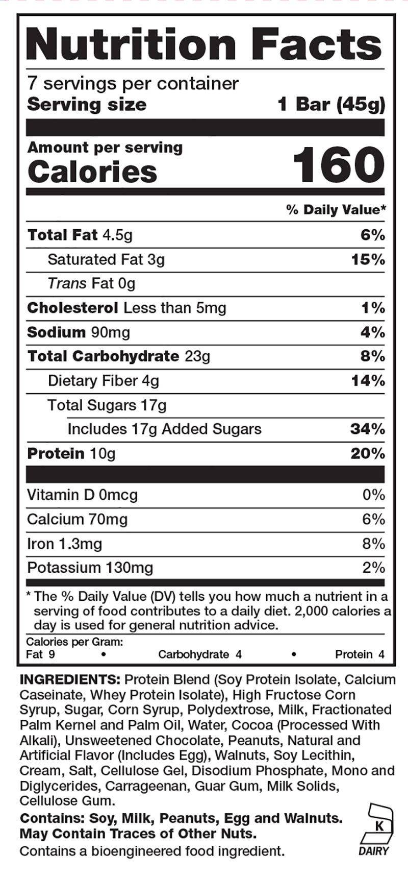 Protein Blend (Soy Protein Isolate, Calcium Caseinate, Whey Protein Isolate), High Fructose Corn Syrup, Sugar, Corn Syrup, Polydextrose, Milk, Fractionated Palm Kernel and Palm Oil, Water, Cocoa (Processed With Alkali), Unsweetened Chocolate, Peanuts, Natural and Artificial Flavor (Includes Egg), Walnuts, Soy Lecithin, Cream, Salt, Cellulose Gel, Disodium Phosphate, Mono and Diglycerides, Carrageenan, Guar Gum, Milk Solids, Cellulose Gum.