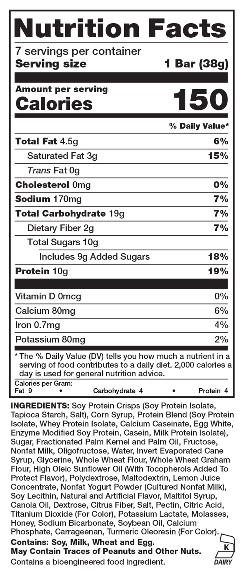 Soy Protein Crisps (Soy Protein Isolate, Tapioca Starch, Salt), Corn Syrup, Protein Blend (Soy Protein Isolate, Whey Protein Isolate, Calcium Caseinate, Egg White, Enzyme Modified Soy Protein, Casein, Milk Protein Isolate), Sugar, Fractionated Palm Kernel and Palm Oil, Fructose, Nonfat Milk, Oligofructose, Water, Invert Evaporated Cane Syrup, Glycerine, Whole Wheat Flour, Whole Wheat Graham Flour, High Oleic Sunflower Oil (With Tocopherols Added To Protect Flavor), Polydextrose, Maltodextrin, Lemon Juice Concentrate, Nonfat Yogurt Powder (Cultured Nonfat Milk), Soy Lecithin, Natural and Artificial Flavor, Maltitol Syrup, Canola Oil, Dextrose, Citrus Fiber, Salt, Pectin, Citric Acid, Titanium Dioxide (For Color), Potassium Lactate, Molasses, Honey, Sodium Bicarbonate, Soybean Oil, Calcium Phosphate, Carrageenan, Turmeric Oleoresin (For Color).
